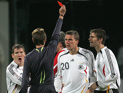 ポルディ一発レッド!(48分) 相手のファールに怒って、見事に蹴りを入れてました…。